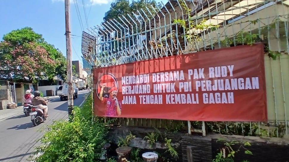 Spanduk tersebut dengan background merah tulisan warna putih bertuliskan "Mengabdi Bersama Pak Rudy Berjuang untuk PDI Perjuangan Jawa Tengah Kembali Gagah".