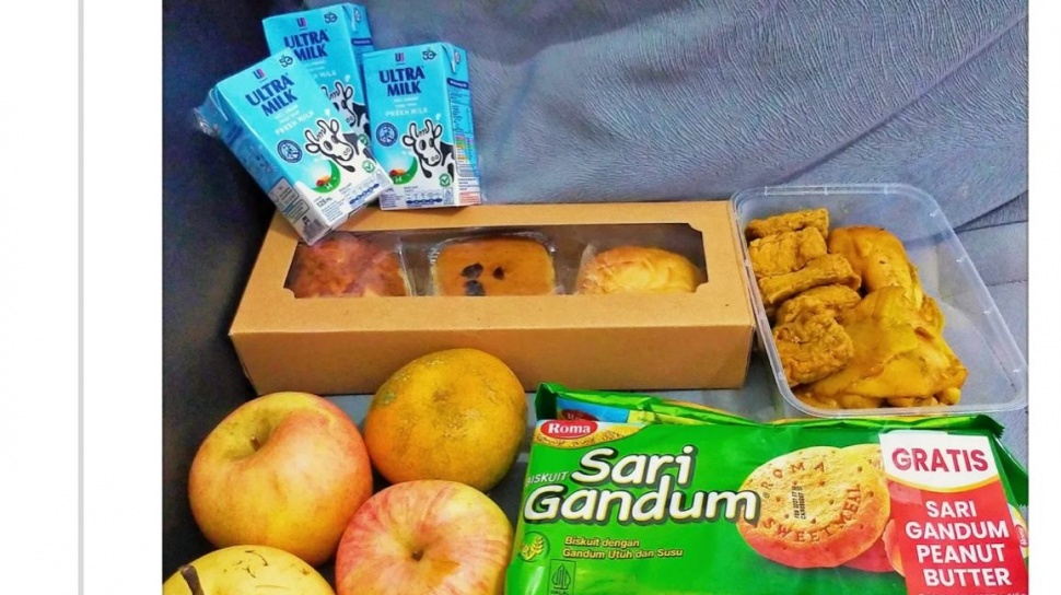 Dalam paket tersebut terdapat roti tawar, satu buah pir, buah jambu, buah jeruk, satu telur rebus, dua biskuit kering, tiga kurma, satu bundel kacang polong, dan enam kotak susu.