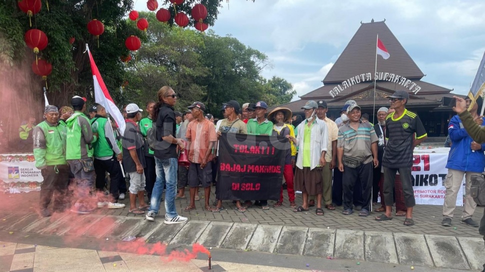 SuaraSurakarta.id - Puluhan driver Ojek online (ojol) dan tukang becak di Kota Solo menggelar aksi menolak bajaj beroperasi, Kamis (22/1/2026).
