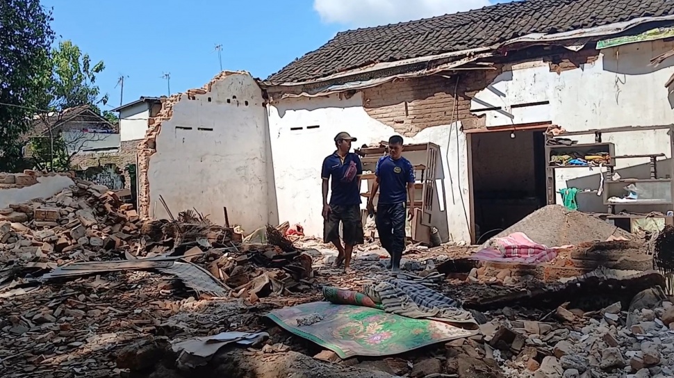 Pantauan di lapangan, warga bersama aparat tengah membersihkan puing-puing bangunan rumah milik Bejo yang roboh.